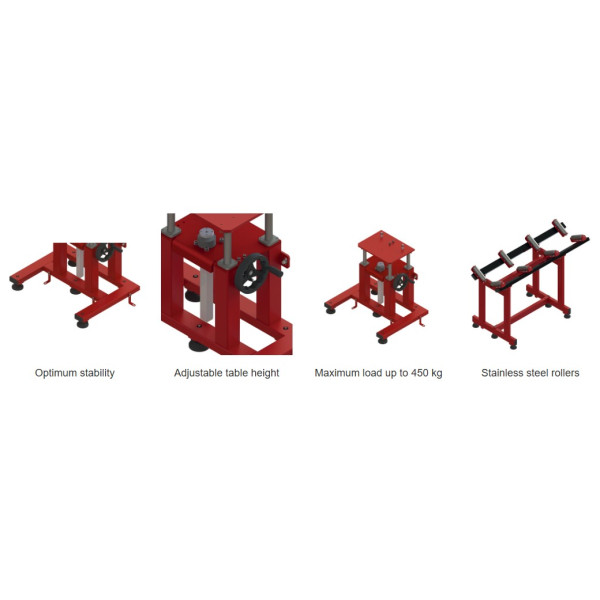 Stojan zabezpečuje efektívne a bezpečné uloženie rúr pri rezaní, úkosovaní a orbitálnom zváraní. Umožňuje presné nastavenie výšky a poskytuje maximálnu stabilitu aj pri dlhých alebo ťažších rúrkach.